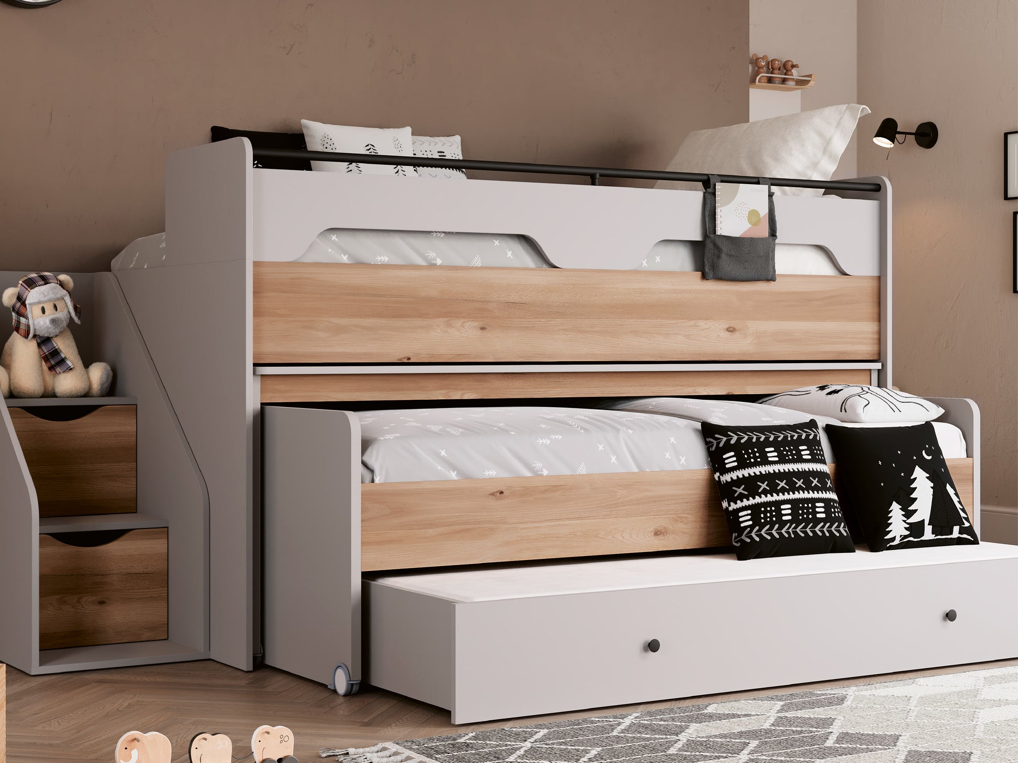 Sağlam yapısı (varsayım) ve güvenli korkuluk sistemleri (varsayım), ranzanın her katında dingin ve güvenilir bir kullanım sağlar.