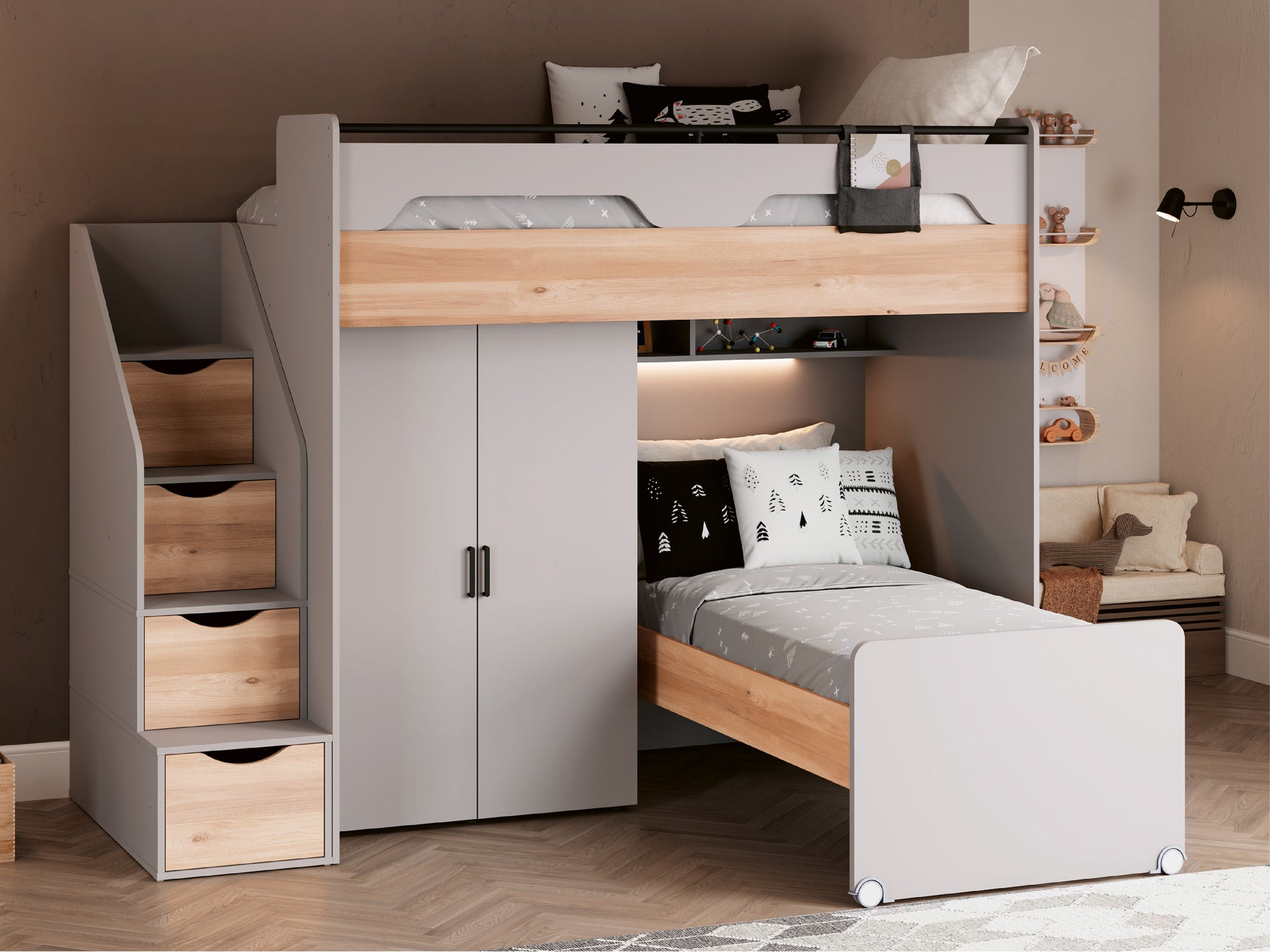 Modüler yapısı (varsayım), alt ve üst katlarda uyku, çalışma ve depolama (entegre modüllerle) gibi farklı işlevleri bir araya getirerek tam kararında bir çözüm sunar.
