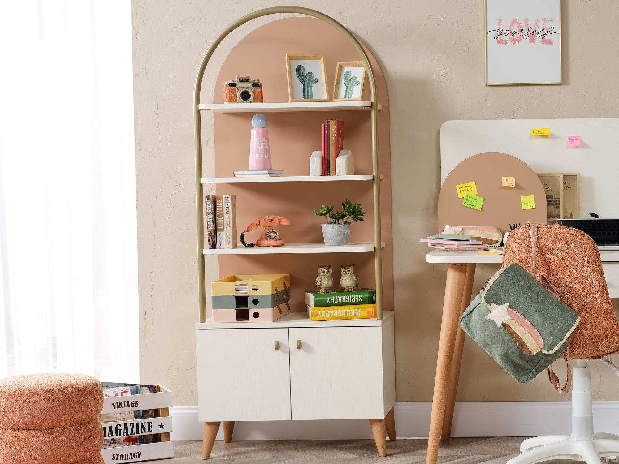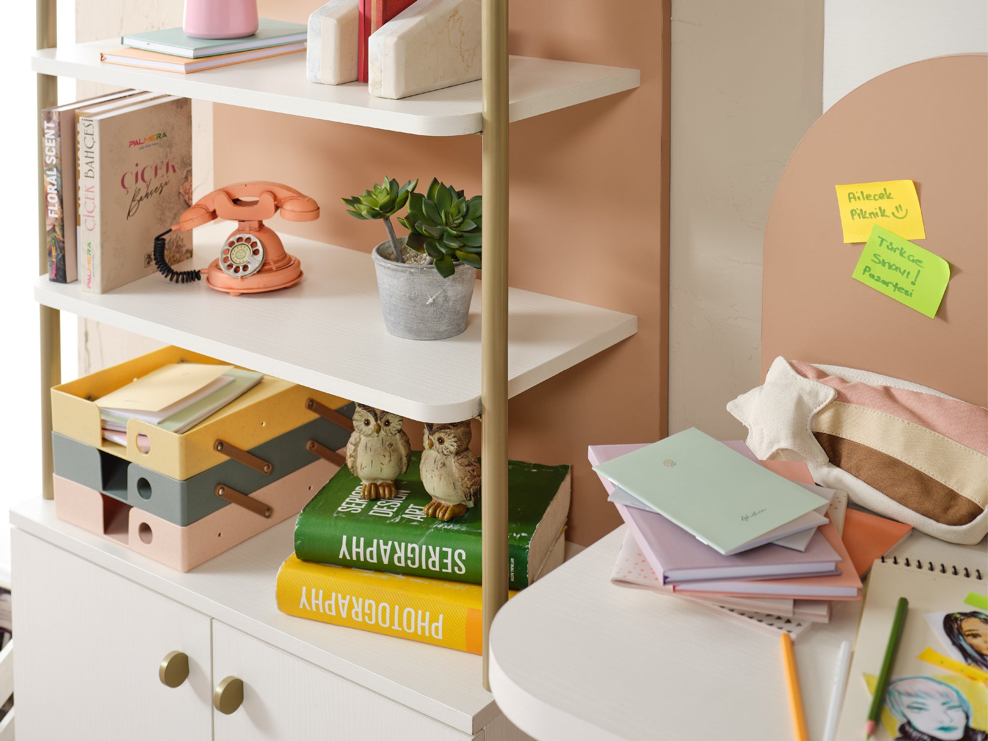 LORENA Kitaplık, modern tasarımıyla genç odalarına hem şık bir sergileme alanı hem de maksimum kullanışlılık getiriyor. Kitaplarınızı ve dekoratif objelerinizi özgürce düzenlemeniz için idealdir.