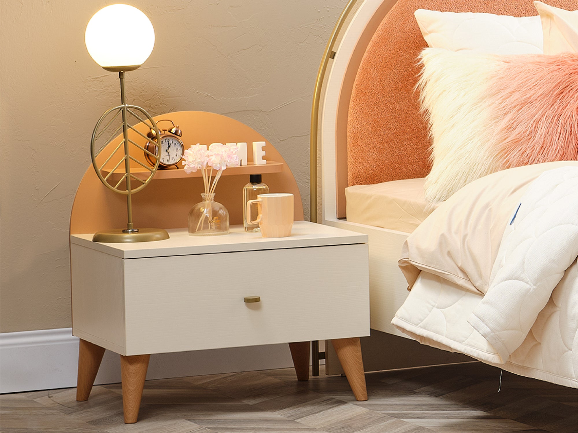 Ahşap görünümlü ABS ayakları ve metal kulpu, modern ve zarif bir kontrast oluşturarak komodinin şık görünümünü tamamlar.