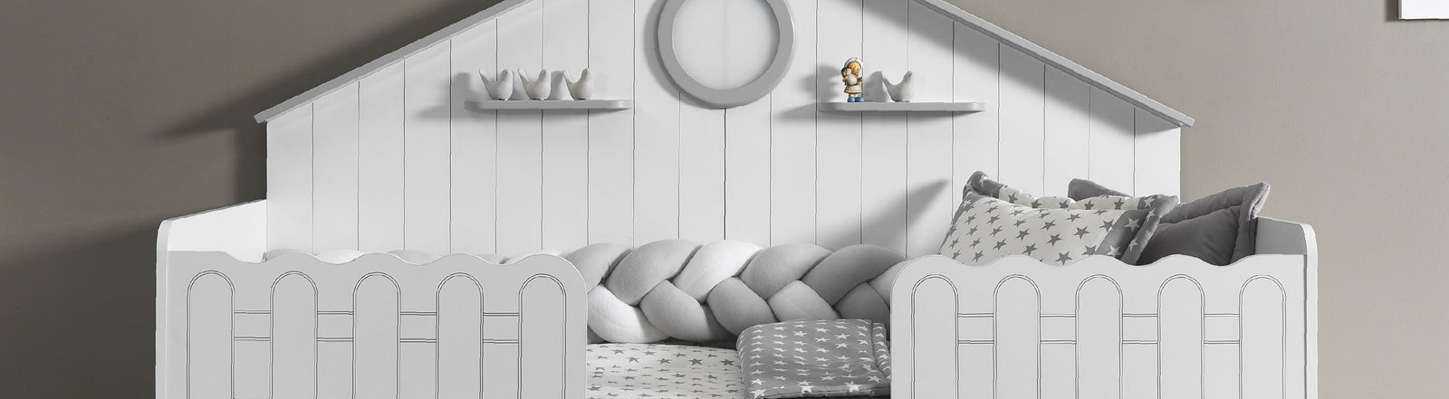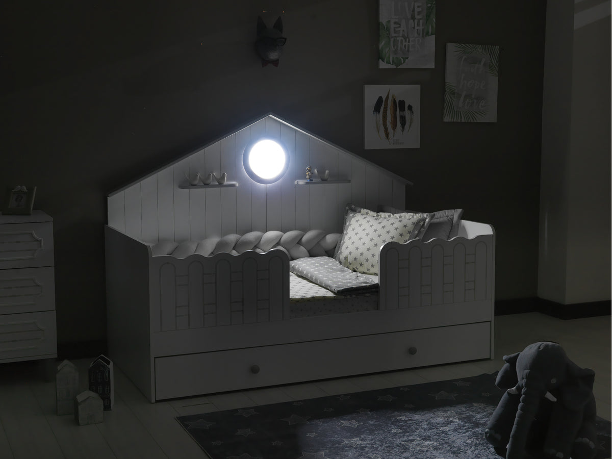 ALVİN Montessori Bebek Odası, modern tasarımın yalın çizgilerini sofistike detaylarla buluşturur. Lazer işleme panelleri ve LED ışıltılı çerçeveleriyle sade ama etkileyici bir görünüm sunar.