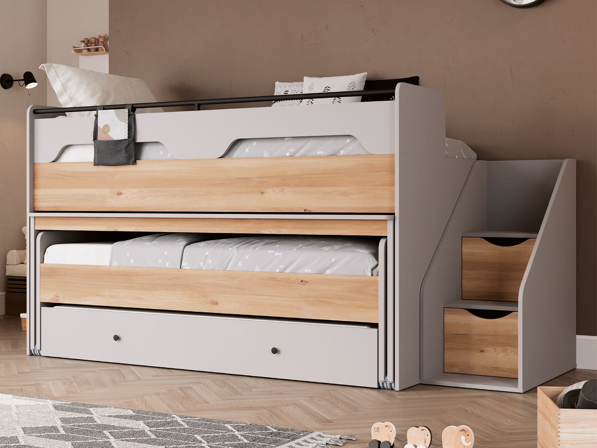 Güvenli korkuluk sistemi ile çocukların tatlı uykuları güvence altındadır; ebeveynlere dinginlik sunar.