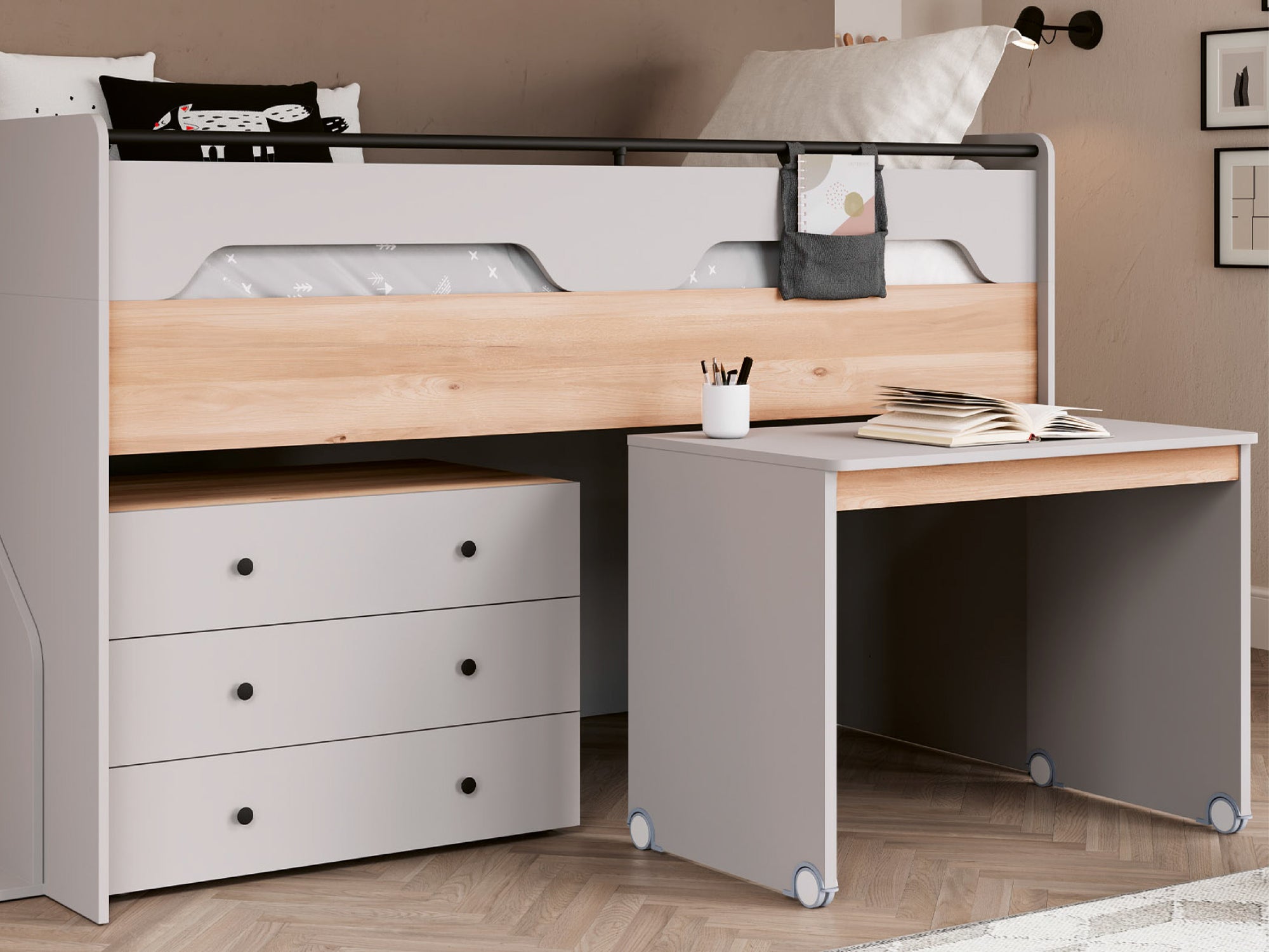 Opsiyonel merdiven alternatifiyle (SAĞA SOLA TAKILABİLME) fonksiyonsellik kazandırılırken yerden tasarruf sağlanır; bu esnek çözüm, odanın düzenine uyum sağlar.